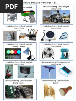 Energi listrik menjadi energi gerak. Macam macam perubahan energi listrik energi listrik adalah energi yang diciptakan oleh elektron yang bergerak melalui konduktor listrik. Contoh bentuk energi seperti listrik mekanik elektromagnetik suara kimia termal dan energi nuklir. Daftar isi1 perubahan energi listrik11 hukum kekekalan energi2 pengertian energi21 pengertian energi. Energi listrik banyak digunakan dalam kehidupan sehari hari. Contoh perubahan energi dalam kehidupan adalah topik yang kami ulas.