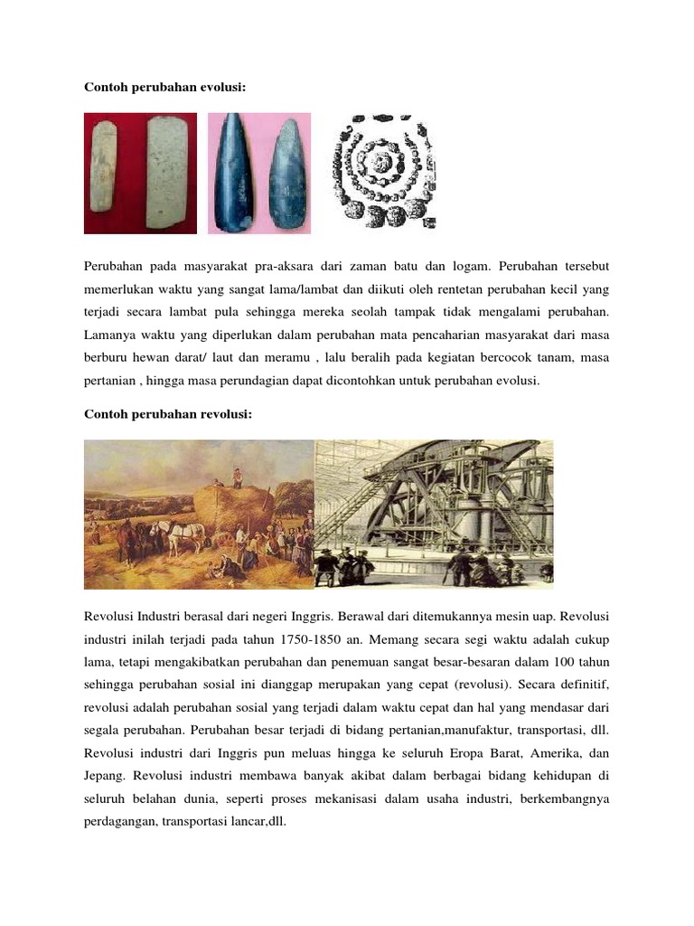 Contoh perubahan evolusi dan revolusi. Evolusi adalah perubahan pertumbuhan perkembangan secara berangsur angsur dan perlahan lahan sedikit demi sedikit. 21 contoh perubahan evolusi dan revolusi dan dampaknya. Simak dan perhatikan materi di bawah ini. Contoh perubahan revolusi dan evolusi. Mari kita bahas gaes. Hal ini mutlak tidak bisa kita hindari sebab dengan semakin berkembangnya teknologi yang semakin canggih akan pula berdampak pada perubahan sosial masyarakat.