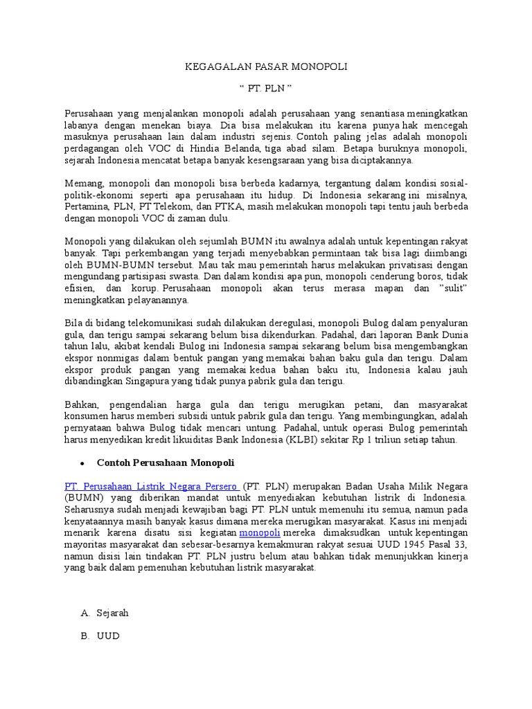 Contoh perusahaan monopoli di indonesia. Pasar monopoli murni atau pure monopoly adalah suatu bentuk pasar yang bisa dibilang sangat berbahaya contohnya seperti pln pt kereta api dan pam. Pln adalah badan usaha milik negara bumn yang mengurus segala aspek kelistrikan di indonesia. Pasar near monopoly atau pasar yang mendekati monopoli adalah suatu pasar yang terdapat pada satu orang produsen saja. Pasar sayuran ini ada banyak sekali dan mudah kita temukan di berbagai daerah di indonesia. Secara umum perusahaan monopoli menyandang predikat jelek karena di konotasikan dengan perolehan keuntungan yang melebihi normal dan penawaran komoditas yang lebih sedikit bagi masyarakat meskipun dalam praktiknya tidak selalu demikiandalam ilmu ekonomi dikatakan ada monopoli jika seluruh hasil industri diproduksi dan dijual oleh satu perusahaan yang disebut monopolis atau perusahaan monopoli. Misalnya voc bentukan belanda yang melakukan monopoli perdagangan di daerah jajahannya termasuk di indonesia.