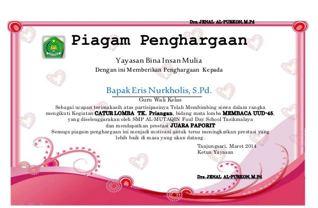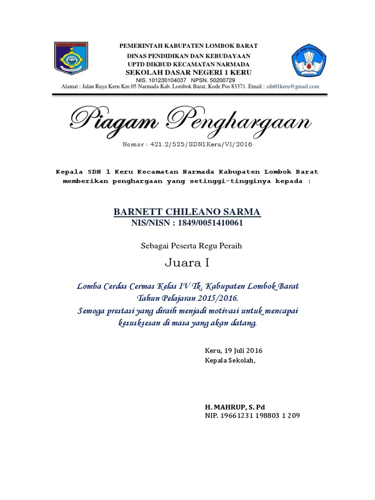 Juara har 1. Untuk lebih jelasnya bapak ibu guru bisa melihat penampakan contoh piagam penghargaan siswa terbaru di bawah ini. Download file contoh piagam siswa berprestasi. Juara har 1 lomba penemu alat inovasi kab sleman th 08 5. Melalui sertifikat penghargaan pesrta didik siswa diharapkan akan menumbuhkan semangat semakin berprestasi kedepannya.