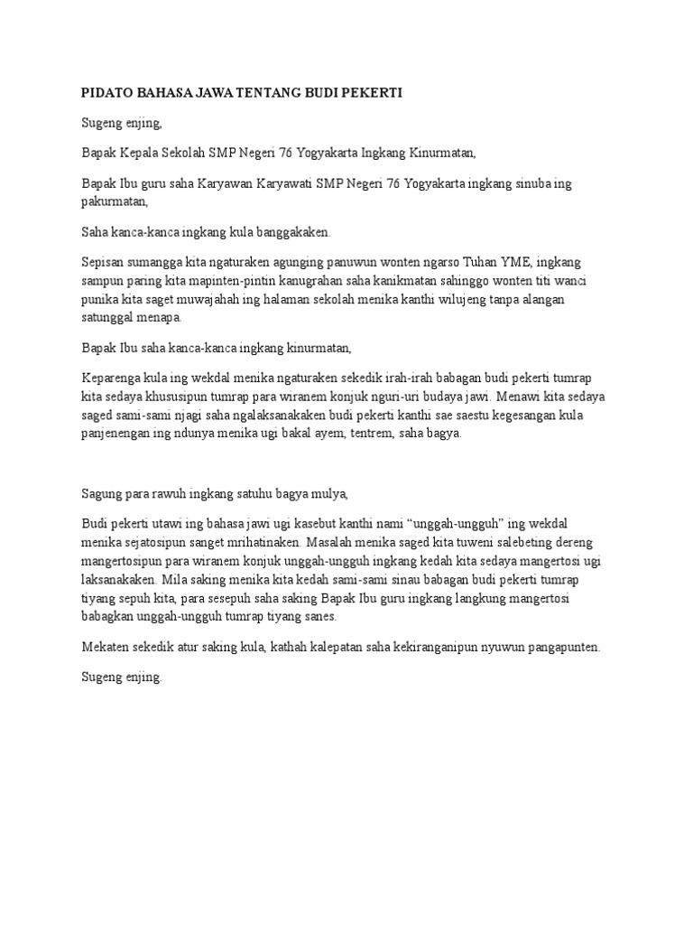 Agar kami dapat dipercaya oleh orang lain kami berusaha untuk menjadi orang yang jujur. Silahkan anda edit seperti. Pidato dengan tema budi pekerti bisa disampaikan pada acara seremonial atau acara yang dilakukan di instansi. Contoh pidato bahasa jawa krama selanjutnya adalah tentang budi pekerti.