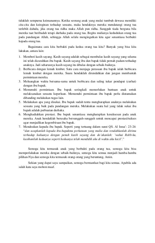 Berbakti kepada kedua orang tua merupakan salah satu amal shaleh yang mulia bahkan disebutkan berkali kali dalam al quran tentang keutamaan berbakti pada orang tua. Silahkan anda edit seperti. Berbakti kepada kedua orang tua adalah perbuatan yang mulia dan di cintai allah sudah semestinya kita senantiasa menjalankan perintah allah yakni berbakti kepada kedua orang tua. Berbakti kepada kedua orang tua termasuk ibadah dan sangat besar pahalanya. Pidato berbakti kepada orang tua adalah contoh teksnaskah pidato pendidikan menggunakan bahasa indonesia. Iwan budiarso 82687 views.