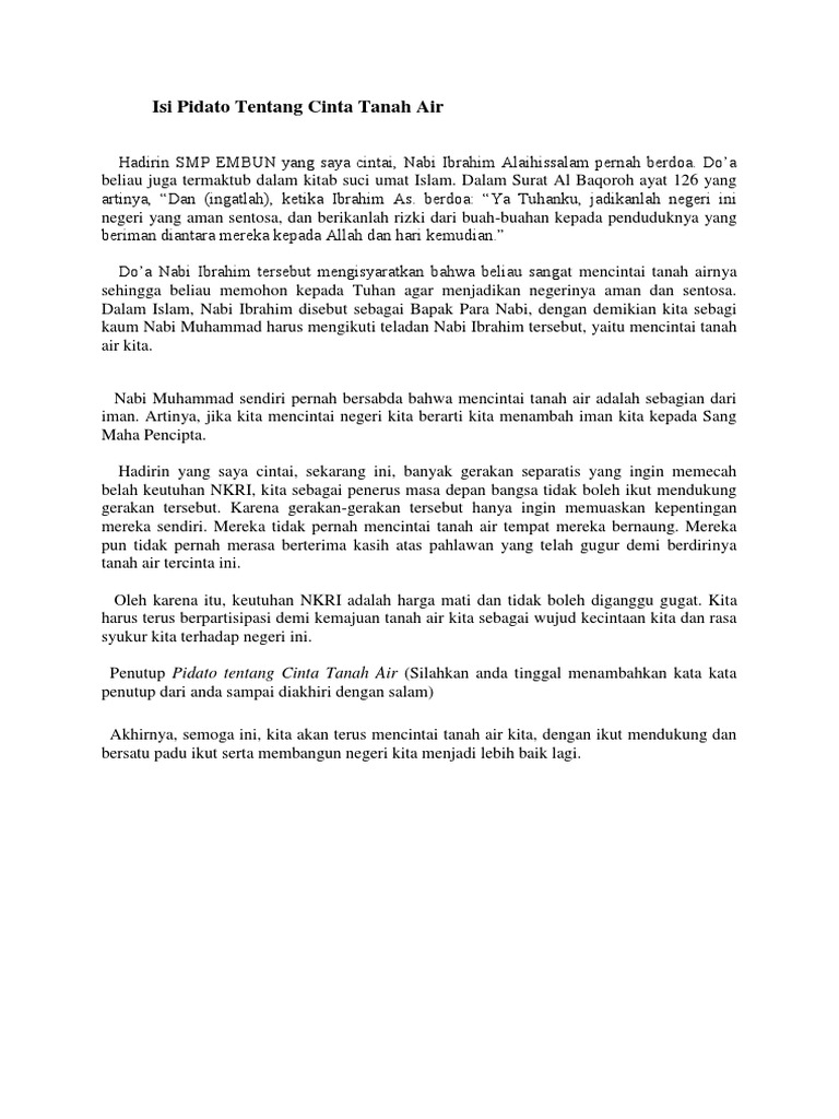 Doc pidato cinta tanah air mnr rafi academiaedu. Salam sejahtera bagi kita semua. Teks pidato manfaat cinta tanah air teks pidato artikel cinta tanah air teks pidato cinta tanah air teks pidato dan contoh cinta tanah air contoh sikap cinta tanah air di lingkungan sekolah teks pidato ciri ciri cinta tanah air teks pidato wujud cinta tanah air teks pidato cinta tanah air menurut para ahli. Hal itu bisa kita lakukan dengan menaati setiap peraturan yang berlaku. Pidato cinta tanah air mencintai tanah air adalah sesuatu yang harus ditanamkan sejak dini terlebih lagi kepada anak anak usia muda. Jika ada beberapa kesalahan mohon dikoreksi karena tidak ada manusia di dunia ini yang benar benar sempurna.