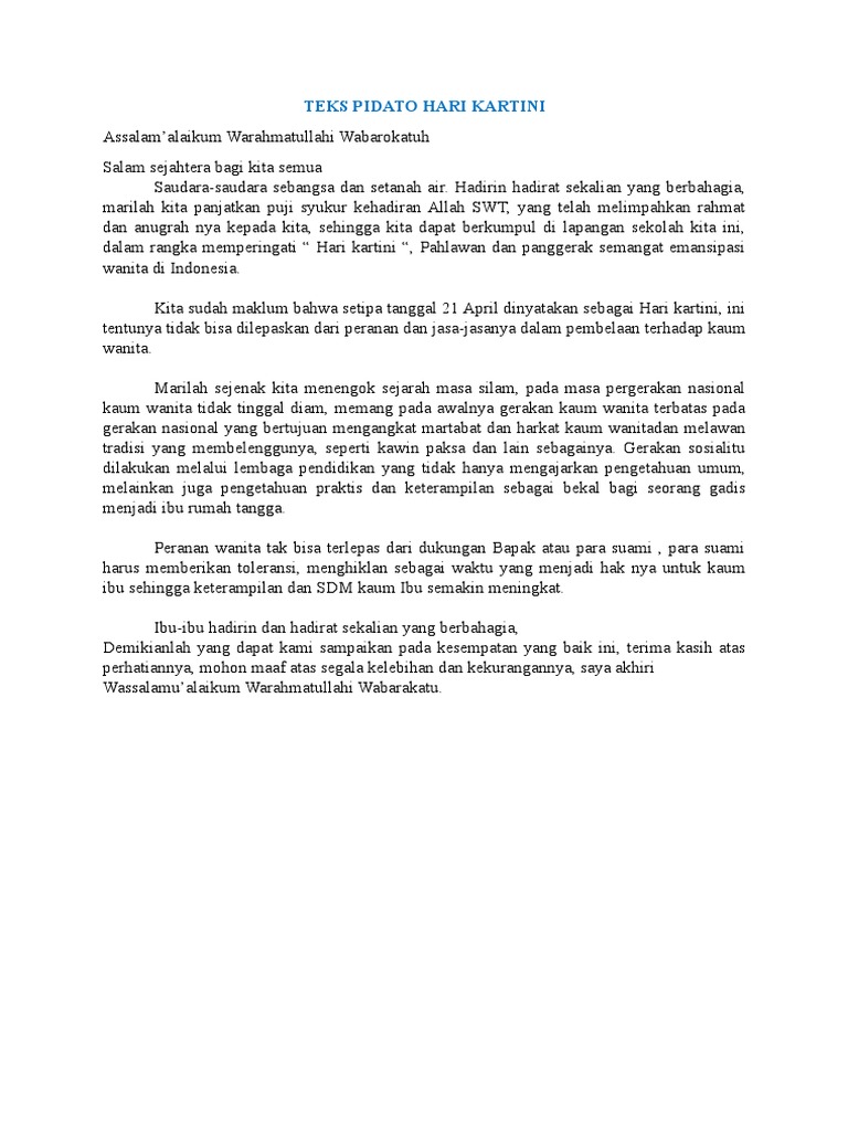 Yang semua lapisan bangsa indonesia memperingati hari kartini yakni merupakan hari kebangkitan bagi wanita yang mulanya dipelopori oleh wanita ra. Kartini telah berhasil menggelorakan gagasan kemanusiaan wanita dan menggugat hak azazi kemanusiaan hak hak persamaan dan kemerdekaan untuk hidup bermasyarakat dan menikmati kebahagiaan hidup dan kehidupan selaku anugreah allah kepada segenap manusia. Kartini yang telah berusaha menyamakan derajat wanita dan pria. Jika anda saat ini sedang mencari teks pidato memperingati hari kartini secara singkat mungkin contoh teks pidato berikut ini bisa anda jadikan referensi. Kartini adalah pahlawan bangsa yang memperjuangkan hak asasi wanita. Salam sejahtera bagi kita semua.