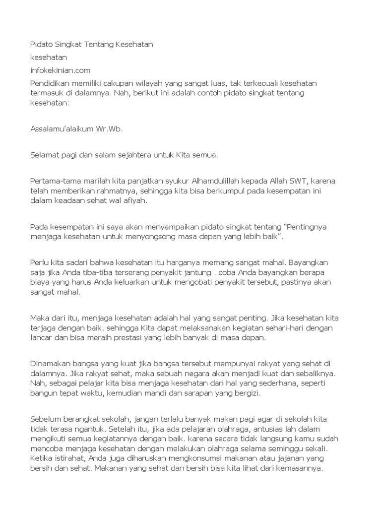 Pidato kesehatan biasanya dibawakan dalam menyambut hari hari tertentu yang biasanya berhubungan dengan kesehatan misalnya pada hari kesehatan sedunia atau pada acara acara tertentu di sekolah. Teks pidato dengan judul pola hidup sehat ini bisa menjadi referensi juga para siswa untuk melatih diri membaca pidato di depan kelas. Contoh pidato singkat terbaru tentang kesehatan salah satu tema pidato yang sering di gunakan adalah tema tentang kesehatan. Pada umumnya seseorang tidak hanya memperhatikan suara pidato saja melainkan juga bagaimana ekspresi wajah dan gerak gerik tubuh si pembawa. Pembukaan pidato tentang narkoba. Contoh pidato singkat bahasa inggris tentang kesehatan dan artinya berpidato merupakan hal yang terkadang menegangkan bagi kebanyakan orang.