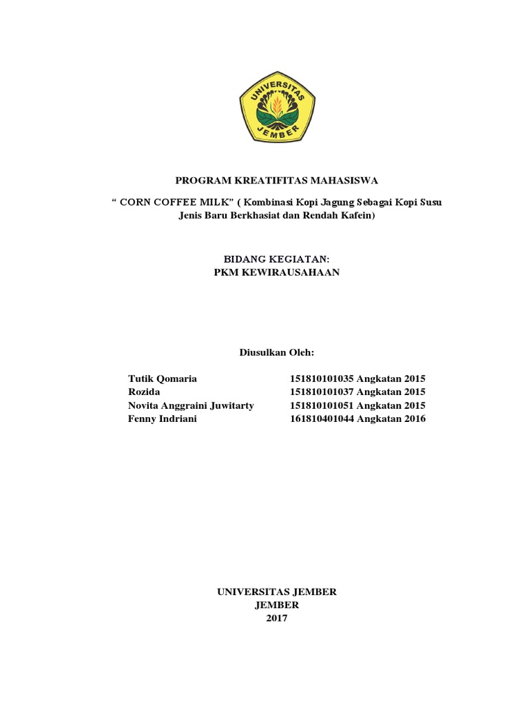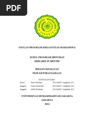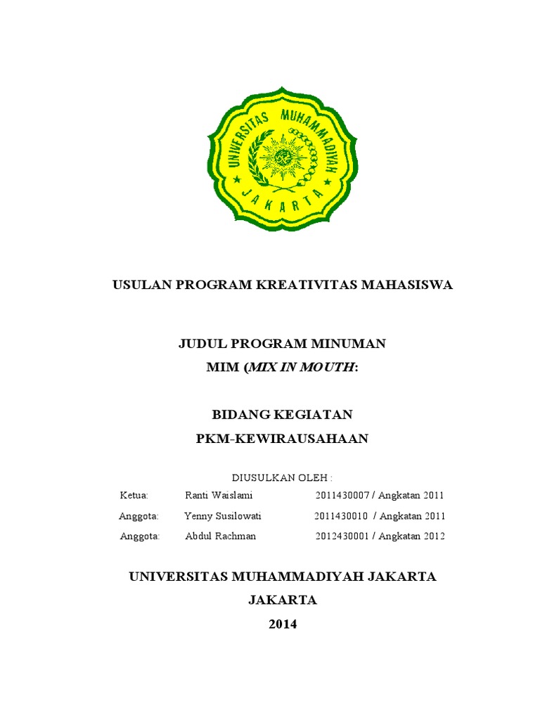 Kebetulan pada artikel kali ini saya akan memberikan contohnya secara lengkap kepada kalian semua. Untuk melaksanakan program kewirausahaan ini perlu dilakukan pembekalan berupa pelatihan untuk membentuk team work yang solid dan profesional dalam pengembangan usaha kopi rasa buah tersebut. Academiaedu is a platform for academics to share research papers. Aspek sosial ekonomi. Minuman mim mix in mouth bidang kegiatan pkm kewirausahaan diusulkan oleh. Dita rahmanda 201471003 wina indriyana 201471047 selly nofriana 201471081.