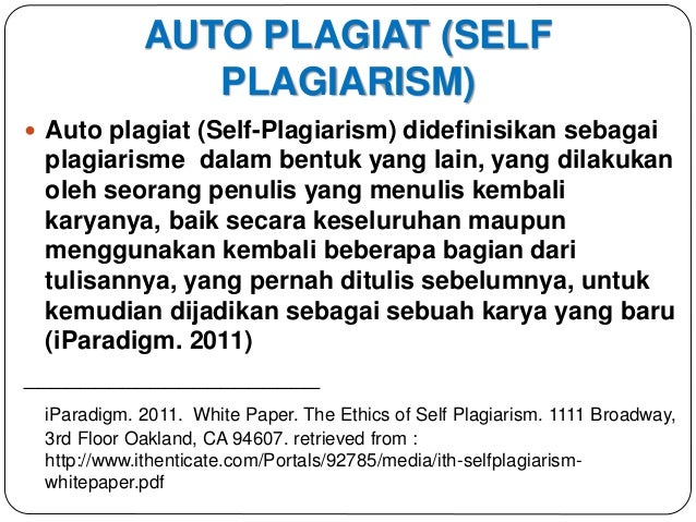 Misalnya menjiplak dan menerbitkan karya tulis orang lain atas nama dirinya sendiri. Jenis jenis plagiarisme pada 2013 ithenticate melakukan survey terhadap para peneliti dengan responden sebanyak 334 peneliti dari 50 negara. Plagiat total berarti lebih dari 70 isi karya tulis ilmiahnya merupakan plagiat dari karya orang lain. Ada dua macam tindakan plagiat yang dijumpai dalam karya tulis ilmiah yaitu plagiarisme tidak sengaja inadvertent plagiarism dan plagiarisme yang disengaja deliberate plagiarismplagiarisme tidak disengaja adalah plagiarisme yang terjadi karena ketidaktahuan ignorancy penulis terhadap perkembangan ilmu yang menjadi bidang spesialisasinya. Dalam penulisan karya ilmiah atau penelitian seorang dosen atau guru sering kita jumpai sebuat surat pernyataan bahwa artikel yang ditulisnya adalah karya sendiri atau bukan plagiat meniru dan membajak karya orang lain. Plagiat sedang mempunyai prosentasi 30 70 dalam sebuah karya tulis yang dibuat.