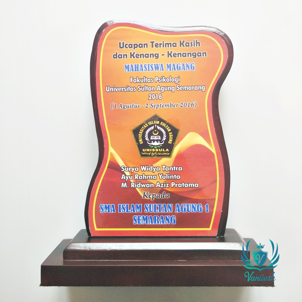 Kenang kenangan untuk kantor. Secara garis besar isi kata kata yang dimuat dalam plakat hanya meliputi ucapan terima kasih.