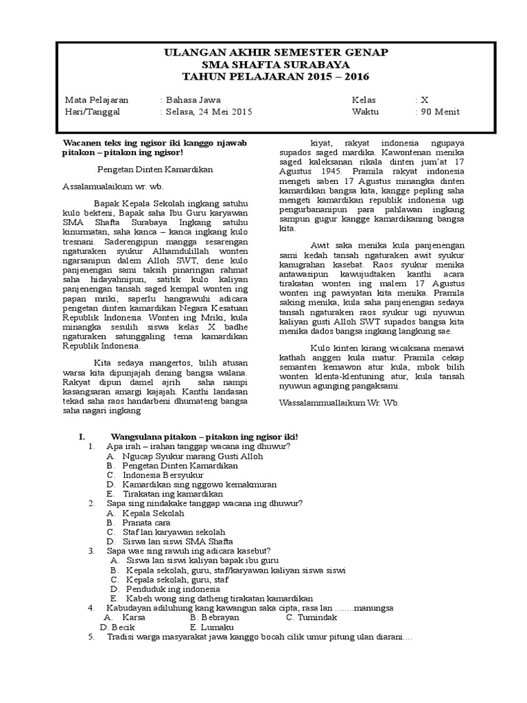 2contoh teks pranatacara bahasa jawa acara pengajian assalaamualaikum warahmatullaahi wabarakaatuhu innalhamdalillaah nahmaduhu wanastainuhu wanastaghfirruhu wanauudzubillahi min syuruuri anfusina wa min sayyiati amaalina may yahdihillahu fala mudzillalah wa may yudlill fala haadiyalah asyhadu an laailaaha illallaah wahdahu laa syariikalahu wa asyhadu anna muhammadan. Berikut ini contoh sesorah bahasa jawa 17 agustus hut ri singkat. Contoh pidato bahasa jawa tentang pendidikan assalamualaikum wr.