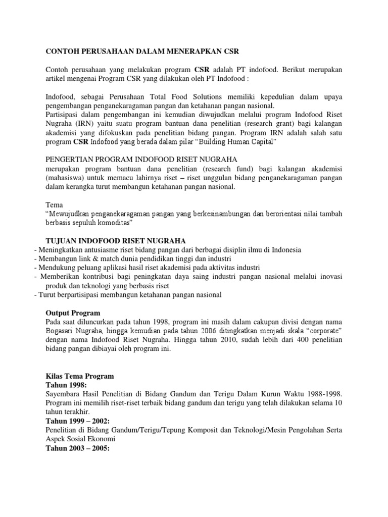 Contoh program csr perusahaan. Csr program corporate social reponsibility merupakan salah satu kewajiban yang harus dilaksanakan oleh perusahaan sesuai dengan isi pasal 74 undang undang perseroan terbatas uupt yang baru. Undang undang ini disyahkan dalam sidang paripurna dpr. Csr corporate social responsibility adalah suatu konsep atau tindakan yang dilakukan oleh perusahaan sebagai rasa tanggung jawab perusahaan terhadap social maupun lingkungan sekitar dimana perusahaan itu berada seperti melakukan suatu kegiatan yang dapat meningkatkan kesejahteraan masyarakat sekitar dan menjaga lingkungan memberikan beasiswa untuk anak tidak mampu di daerah tersebut dana. Posting pada ekonomi ditag 10 contoh csr 15 definisi csr menurut para ahli 4 pendekatan csr 5 komponen csr apa yang anda ketahui tentang pemasaran artikel csr perusahaan bab 2 tinjauan pustaka csr cara mendapatkan dana csr cara mendapatkan dana csr pertamina 2019 contoh corporate social marketing contoh csr aqua contoh csr di. Menurut penulis kesuksesan program program csr yang dilakukan oleh aqua tidak terlepas dari faktor kredibilitas perusahaan yang telah menjadi salah satu perusahaan penghasil air mineral terkemuka di indonesia sehingga memiliki profit keuangan yang cukup besar. Pemimpin redaksi majalah mix lis hendriani mengatakan mengacu pada konsep kotler dan lee anugerah indonesias best corporate social initiatives 2018 dikelompokan ke dalam enam kategori.