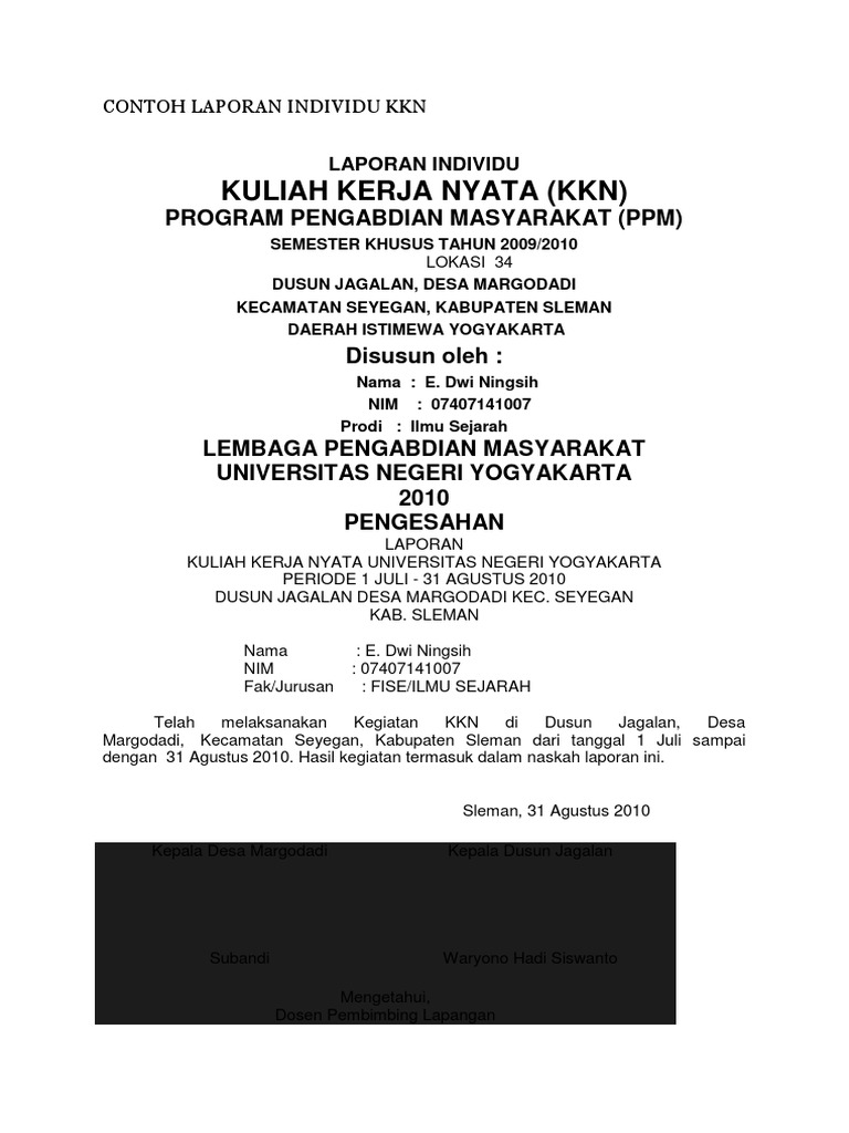 Puji syukur kepada allah swt pencipta alam semesta pemberi kekuatan serta kenikmatan bagi kita semua. Saya tidak bisa menyertakan secara lengkap sempurna. Angkatan xv tahun 2015. Sekarang kita coba melakukan brainstorming mengenai contoh kegiatan atau. Contoh laporan kkn individu laporan individu. Program individu mahasiswa.