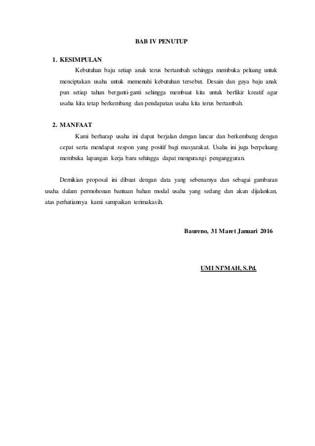 Contohnya adalah promosi melalui media online seperti media sosial website dan lain sebagainya. Termasuk salah satu jen is porposal ada lah proposal usaha atau proposal bisnis. Contoh proposal usaha bisnis butik. Agar lebih jelas mengenai topik ini ada baiknya juga anda membaca 3 contoh bisnis plan lainnya serta presentasi usaha makanan di foodstartup indonesia. Segmentasi pasar yang akan dimasuki. Pada tulisan ini kami akan memberikan beberapa panduan dasar serta contohnya bagaimana meracang proposal bisnis berdasarkan metode terbaru di tahun 2018.