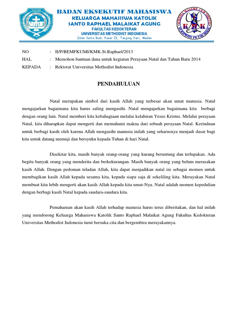 Contoh proposal cari dana natal. 1 berkas hal. Permohonan dana natal kepada yth. Proposal pengajuan dana ke pt biofarma. Bapakibusaudarai di tempat salam sejahtera dalam kasih yesus kristus pertama. Contoh proposal pengajuan dana ke perusahaan. Proposal permohonan bantuan dana natal bersama program matrikulasi kabupaten pegunungan bintang papua.