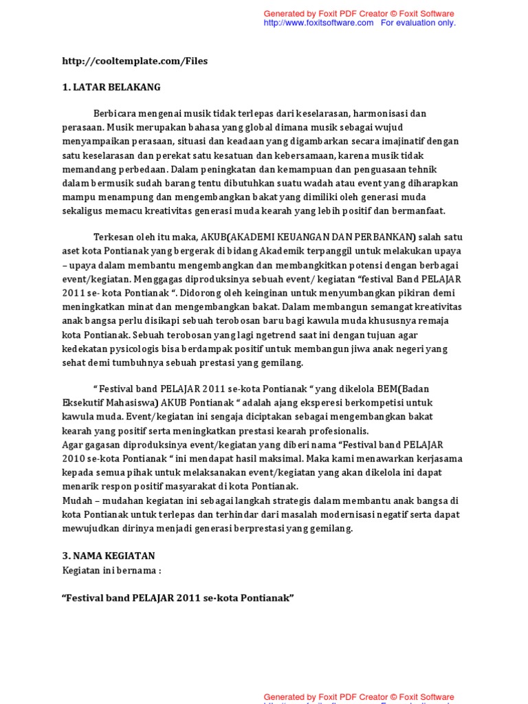 Jadi sebelum memulai sebuah usaha alangkah baiknya apabila membuat sebuah proposal tersebut terlebih dahulu agar semua lebih terarah dan penggunaan biaya lebih teratur. Contoh proposal festival band 1. Contoh proposal kegiatan aspek perencanaan jelas sangat penting untuk diperhatikan sebelum anda memulai suatu kegiatan.