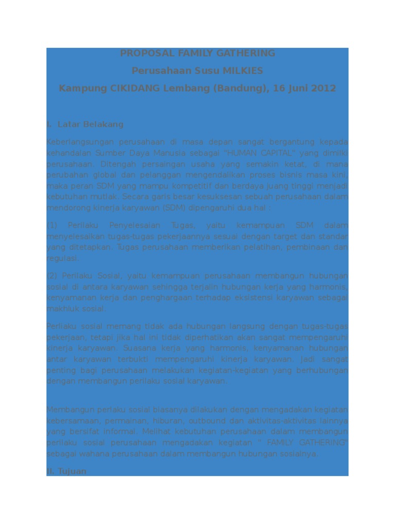 Proposal acara family gathering oleh. Contoh proposal family gathering perusahaan contoh proposal gathering kantor contoh proposal family gathering contoh proposal pengajuan dana gathering contoh proposal kegiatan gathering contoh proposal a car a gathering. Academiaedu is a platform for academics to share research papers. Download contoh proposal family gathering proposal family gathering olehteam peletezing compound 1. Namun lantaran keterbatasan kuota haji per tahunnya umat islam yang ingin ke tanah suci harus melewati masa tunggu. Proposal atau dalam bahasa inggrisnya disebut propose yang berarti pengajuan merupakan salah satu alat yang digunakan untuk memperkenalkan suatu konsep rencana atau blueprint dari suatu proyek kepada yang berwenang dalam tujuan untuk mendapatkan persetujuan atau kepentingan lainnya mulai dari dana atau bantuan.