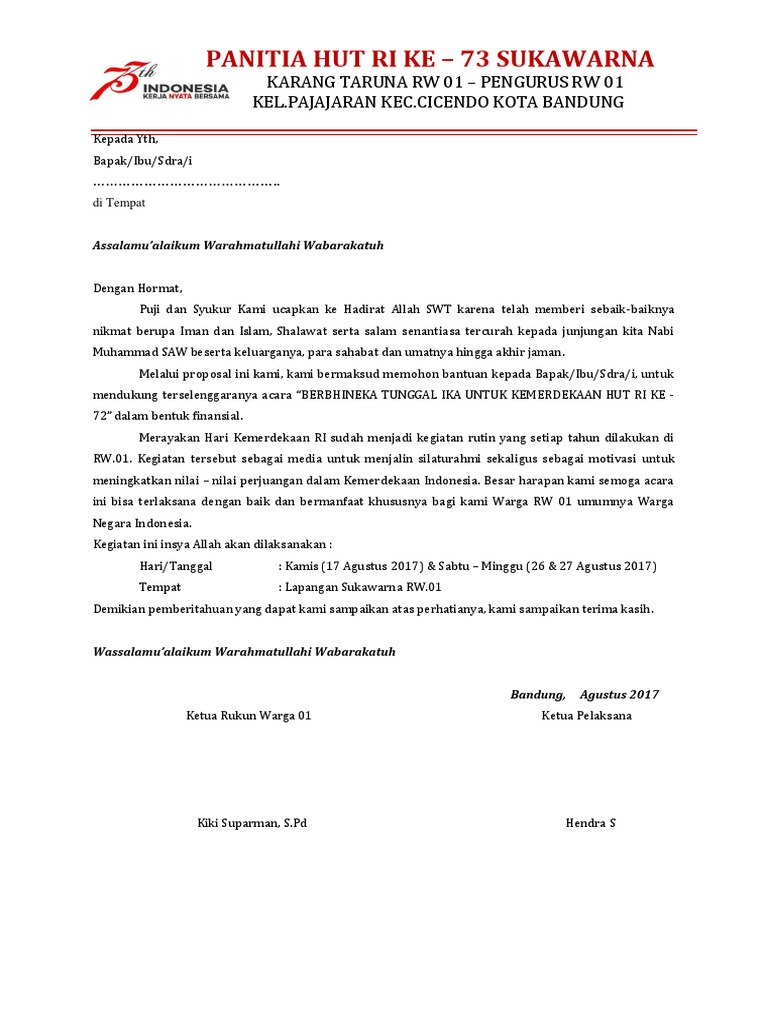 Di smu ypk 1 tenggarong. Hal tersebut tampak di berbagai wilayah indonesia mulai muncul pedagang yang menjual berbagai atribut seperti bendera merah putih umbul umbul dan berbagai atribut pendukung lainnya. Secara sederhana proposal yaitu rencana kegiatan yang dituliskan dalam bentuk rancangan kerja yang akan dilaksanakan. Dan juga logo hut ri ke 74 tahun 2019 sesuai surat edaran mensesneg tentang hut ri. Mengingat akan datangnya hari kemerdekaan ke 74 yang akan jatuh pada tanggal 17 agustus 2019 maka sudah sepatutnya kita sebagai warna negara indonesia mengenang jasa jasa para pahlawan yang telah gugur dalam memperjuangkan kemerdekaan republik indonesia. Contoh proposal 17 agustus 2018 hut ri ke 73 contoh proposal 17 agustus seperti yang sudah kita semua ketahui pada bulan agustis tepatnya tanggal 17 agustus kita selaku warga negara indonesia senantiasa memperingati dan merayakan hari kemerdekaan bangsa indonesia.