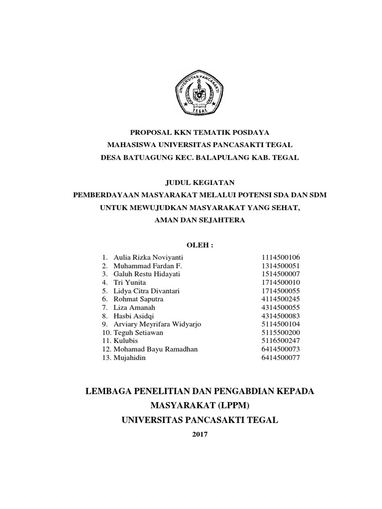 Contoh proposal kkn tematik. 11 latar belakang masalah. Kuliah kerja nyata kkn angkatan xxii. Maka selaku mahasiswa peserta kkn tematik hendaknya selalu berusaha untuk ikut terjun secara langsung melihat dan mencari permasalahan yang timbul dikalangan pengusaha sehingga mendapatkan rencana. Kkn merupakan salah satu kegiatan yang akan di jumpai oleh mahasiswa. Sebelum melakukan pengamatan dan pencarian data langsung di lapangan dilakukan pembagian tugas observasi berdasarkan bidangnya masing masinghal ini dilakukan mengingat program kerja yang akan dilaksanakan di pura mengening harus sesuai dengan masalah dan kebutuhan yang ada di pura mengening dan di wilayah banjar dinas saraseda sedangkan waktu observasi yang telah ditentukan tidak cukup panjang. Proposal kegiatan kkn i.