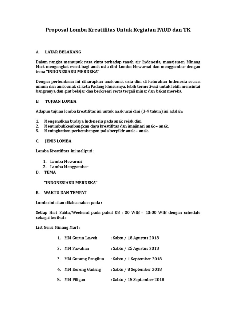 Tk islam shid q jl. Proposal bisnis proposal bisnis berisi mengenai rencana dalam dunia bisnisusaha yang dibuat oleh individu ukm atau perusahaan untuk mendapatkan modal dan kerjasama bisnis. 28000 pembuatan proposal rp. 0800 sd selesai. Lomba mewarnai umumnya menggunakan gambar suasana lingkungan yang agak kompleks meski sebenarnya sederhana mengingat lomba diperuntukan untuk anak kecil. Sehubungan dengan akan diadakannya acara lomba mewarnai tingkat paud tk mewarnai tingkat sd kelas 1 3 menggambar dan mewarnai tingkat sd kelas 4 6 fashion show tingkat tk fashion show tingkat sd kelas 1 6.