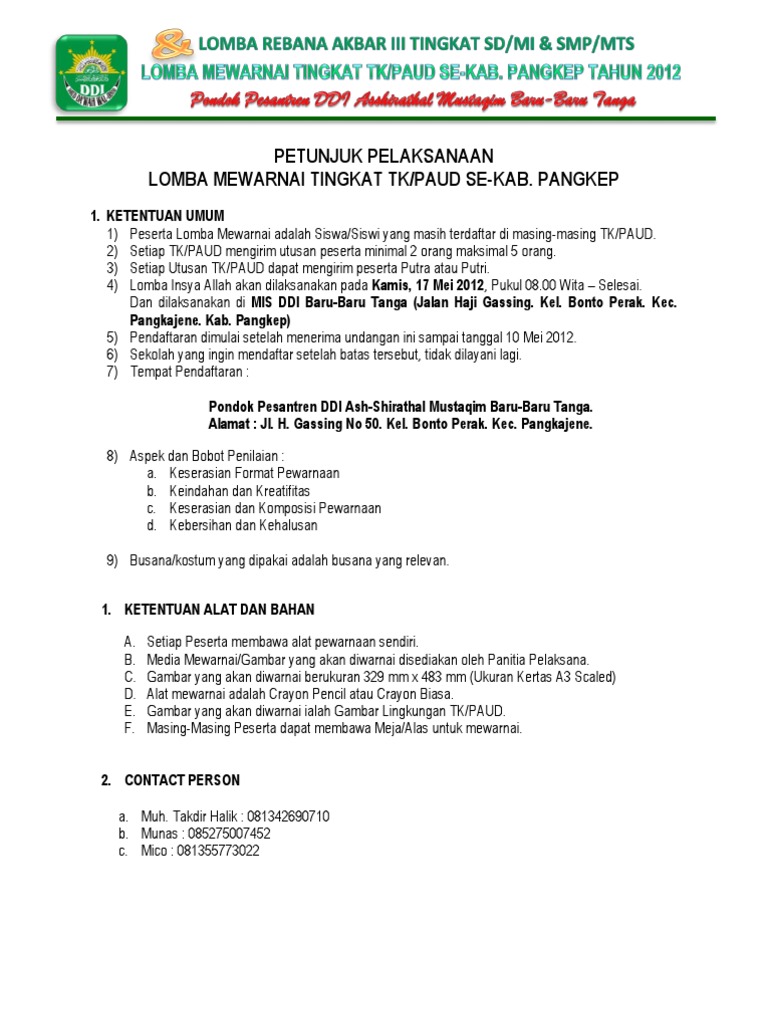 Contoh proposal lomba mewarnai. Latar belakang dalam memaknai peringatan hari jadi kabupaten madiun 668 dan hut ri ke 68 panitia hari besar nasional kecamatan dolopo menyelenggarakan rangkaian peringatan yang memiliki kepedulian terhadap perkembangan dan kemajuan pendidikan. Merupakan proposal yang berisi tentang rencana atau usulan penelitian praktek lapangan lomba karya tulis ilmiah skripsi tesis dan lain lain. Lomba mewarnai bazaar pentas dongeng anak 15 november 2012 m aku anak muslim cinta islam 7 lampiran ii. Mewarnai dan fashion show. Dalam proses pendidikan diperlukan keseimbangan dalam fungsi otak kanan dan otak kiri. Academiaedu is a platform for academics to share research papers.