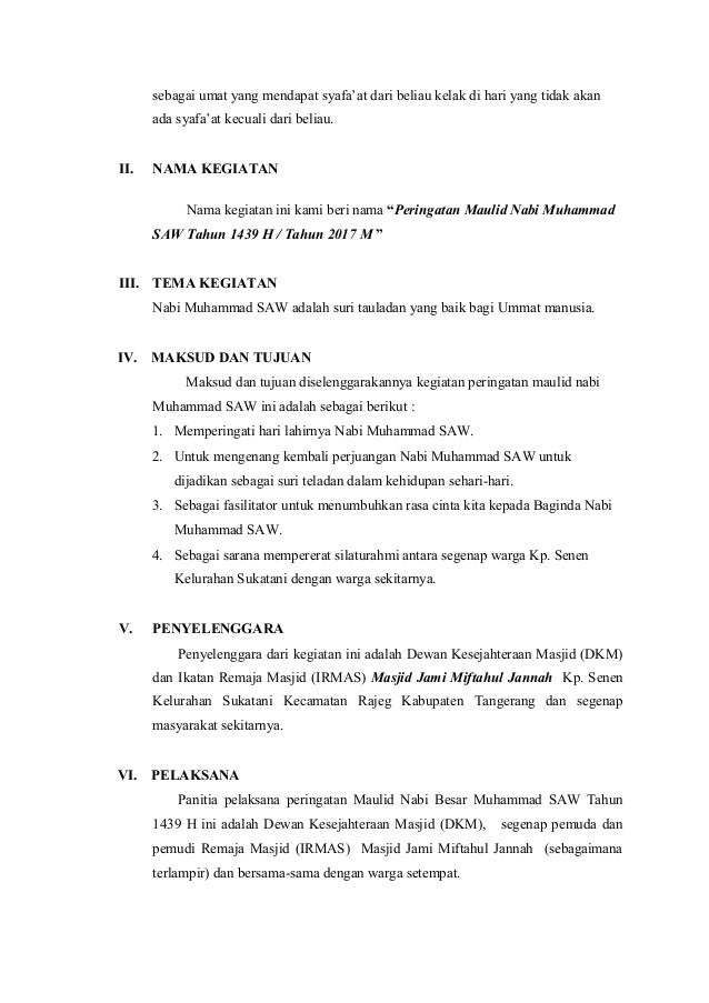 Maulid nabi yang diadakan setiap tanggal 12 rabiul awwal tidak hanya dirayakan dengan hura hura saja tetapi momen ini harus dijadikan sebagai media untuk meningkatkan kecintaan muslim kepada nabi muhammad saw. Panitia peringatan hari besar islam. Demikian proposal kegiatan maulid nabi muhammad saw ini kami buat. Untuk itu kami sampaikan proposal kegiatan memperingati maulid nabi muhammad saw tahun 1437 h oleh dkm baitul muttaqin. Contoh proposal maulid nabi phbi p r o p o s a l. Maulid nabi muhammad merupakan bentuk penghargaan yang sangat besar kepada beliau dan kita harus bangga memiliki hari besar ini.