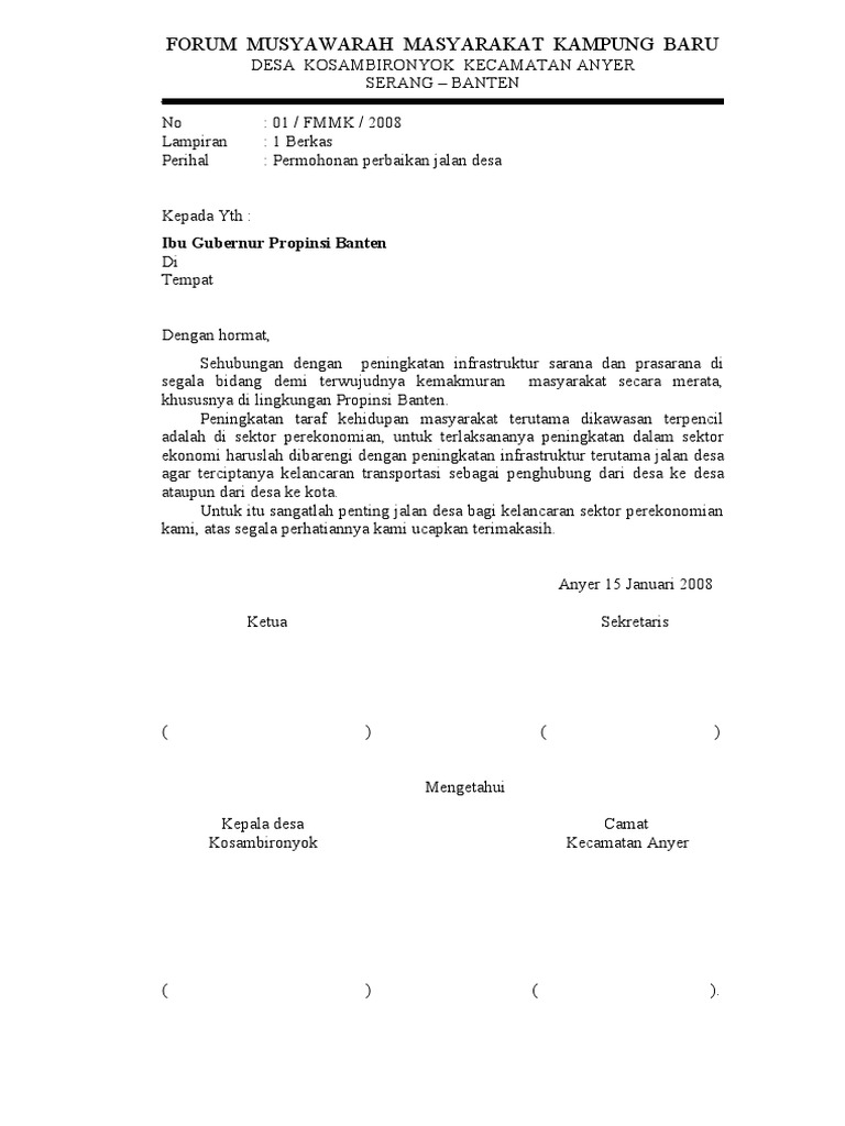 Contoh proposal perbaikan jalan lainnya proposal permohonan bantuan cor blok tingkat usaha rukun tetangga 04 tahun 2012 di. Academiaedu is a platform for academics to share research papers. Conntoh permohonan bantuan pemasangan listrik gratis. Contoh proposal permohonan bantuan perbaikan jalan rabat tahun 2013. 2 pengajuan proposal ini bertujuan untuk menyampaikan permohonan pengaspalan jalan lintas desa yang ada di desa tumbuh mulia dusun dasan tumbu dusun dasan kulur dan dusun gegurun yang menguhubungkan 4 empat yakni desa tumbuh mulia desa suralaga desa bagik payung dan desa dasan borok kecamatan suralaga kabupaten lombok timur. Proposal permohonan bantuan jalan pertanian saraswati update berikut ini contoh proposal permohonan bantuan jalan pertanian.