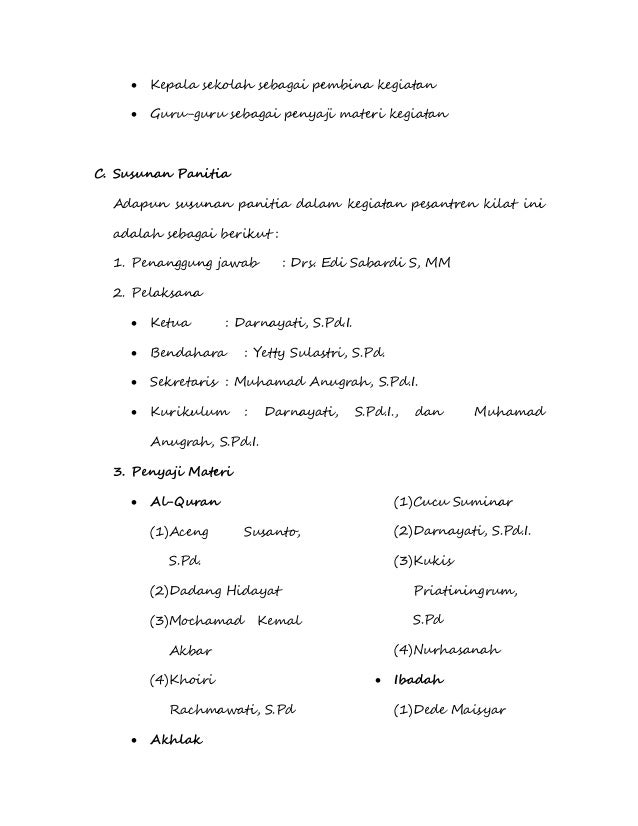 Oleh karena itu penulis sangat yakin contoh proposal ini akan sangat berguna bagi sobat yang membutuhkan. Sd negeri cisarua. Posted by unknown posted on 1341 with 2. Proposal pesantren kilat adalah salah satu hal yang dibutuhkan dalam dunia pendidikan khususnya saat bulan ramadhan tiba. Tahun 143 7 h 201 6 m. Contoh program kerja paskil pesantren kilat sekolahmadrasah ini diharapkan bisa menjawab pencarian anda di internet terkait dengan contoh program kerja paskil pesantren kilat seperti pencarian dengan kara kunci jadwal kegiatan pesantren kilat kegiatan pesantren kilat ramadhan program pesantren kilat 2017 kumpulan proposal pesantren kilat ramadhan kegiatan pesantren kilat sekolah dasar.
