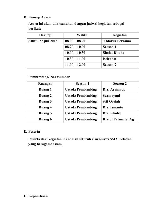 Contoh proposal pesantren kilat sanlat unknown. Proposal kegiatan pesantren kilat ramadhan 1437 h madrasah ibtidaiyah tahun 1437 h. Cibodas desa cisarua kecamatan nagrak. Contoh proposal pesantren kilat terbaru tahun 2018 doc format bulan ramadhan atau bulan puasa sudah memasuki hari pertama dan setiap sekolah seperti tahun tahun sebelumnya harus membuat program kegiatan kegiatan yang bersifat keagamaan terkait bulan puasa. V dana bos bantuan operasional sekolah fasilitas. Fasilitas pelaksanaan kegiatan pesantren kilat dan pengajian akbar ini adalah semua fasilitas milik smp n i purwosari dan fasilitas sewa.