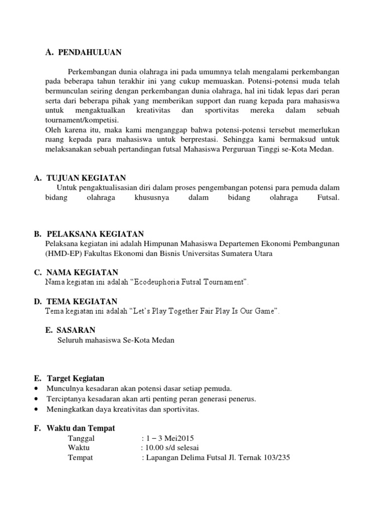 Home proposal contoh proposal tournament futsal. Banyak sekali di google yang menyediakan contoh proposal tetapi untuk turnamen futsal anda bisa mencontoh yang saya buat ini. Sum01ppi 1902ii2012 banjarbaru 12 maret 2012. Sebuah proposal biasanya terdiri dari pendahuluan tujuan peserta waktu dan tempat susunan kepanitiaan anggaran dana dan penutup. Proposal atau dalam bahasa inggrisnya disebut propose yang berarti pengajuan merupakan salah satu alat yang digunakan untuk memperkenalkan suatu konsep rencana atau blueprint dari suatu proyek kepada yang berwenang dalam tujuan untuk mendapatkan persetujuan atau kepentingan lainnya mulai dari dana atau bantuan. Proposal ini dapat anda gunakan manakala anda mengadakan sebuah kegiatan di sekolah maupun di masyarakat kampung anda.