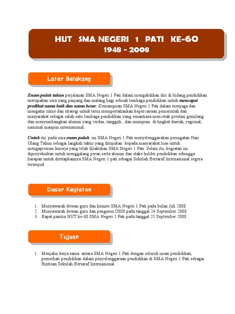 Proposal hut smk n 1 banyumas ke 41. Latar belakang empat puluh satu tahun perjalanan smk negeri 1 banyumas dalam mengabdikan diri di bidang pendidikan merupakan usia yang panjang dan matang bagi sebuah lembaga pendidikan untuk mencapai predikat nama baik dan nama besar.