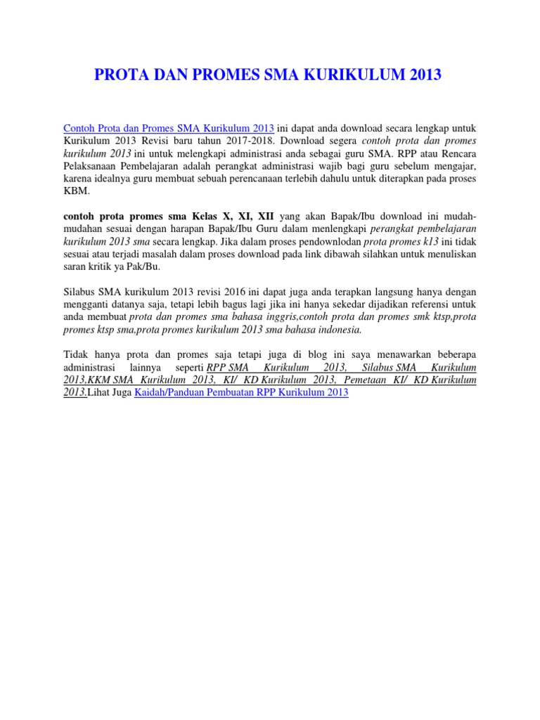 Contoh prota dan promes sma kurikulum 2013. Namun silabus rpp promes dan prota kelas 7 8 dan 9 smpmts yang kami berikan hanyalah merupakan contoh model yang dapat digunakan sebagai referensi guru jika bapak ibu guru belum sempat membuatnya. Dengan adanya prota dan promes kurikulum 2013 ini menjadi bekal pembelajaran yang terinci dan. Dalam postingan ini admin akan share adminstrasi guru berupa prota dan promes jenjang smpmts kelas 9 ix kurikulum 2013 edisi revisi 2018 tahun pelajaran 20192020. Protapromes kelas 9 smpmts program tahunan prota dan program semester promes merupakan perangkat wajib yang harus dimiliki oleh seorang guru baik itu pada jenjang sdmi smpmts smama dan pada satuan pendidikan lainnya. Contoh prota dan promes sma kurikulum 2013 ini dapat anda download secara lengkap untuk kurikulum 2013 revisi baru tahun 2017 2018. Contoh prota dan promes sma kurikulum 2013 ini dapat anda download secara lengkap untuk kurikulum 2013 revisi baru tahun 2017 2018.