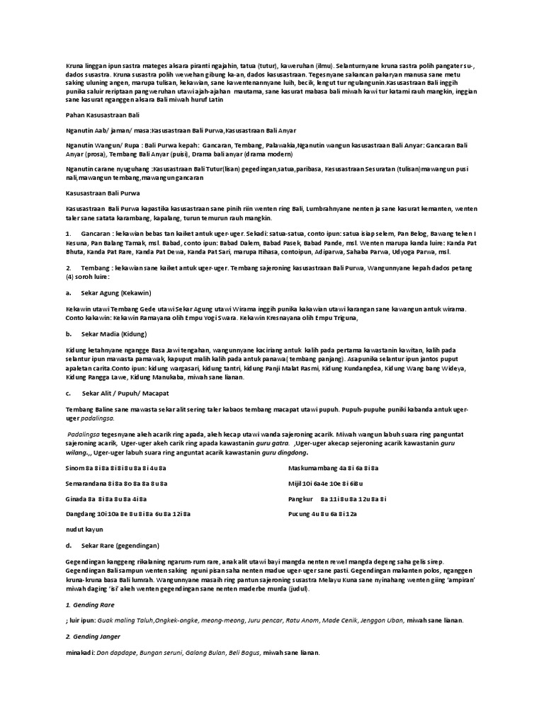 Sekar rare gegendingan gending rare upami. Pepalihan tembang manut pepalihan i gusti ketut ranuh minakadi. Gancaran inggih punika kekawian utawi karangan sane bebas sane nenten kaiket antuk uger uger. Puisi bali purwa satra bali ring bali tembang taler kabawos sekar sane kaperang dados petang soroh luire. Contoh puisi bali purwa sekar rare sekar alit sekar madya sekar agung contoh prosa bali anyar 1. Gancaran inggih punika kekawian utawi karangan sane bebas sane nenten kaiket antuk uger uger.