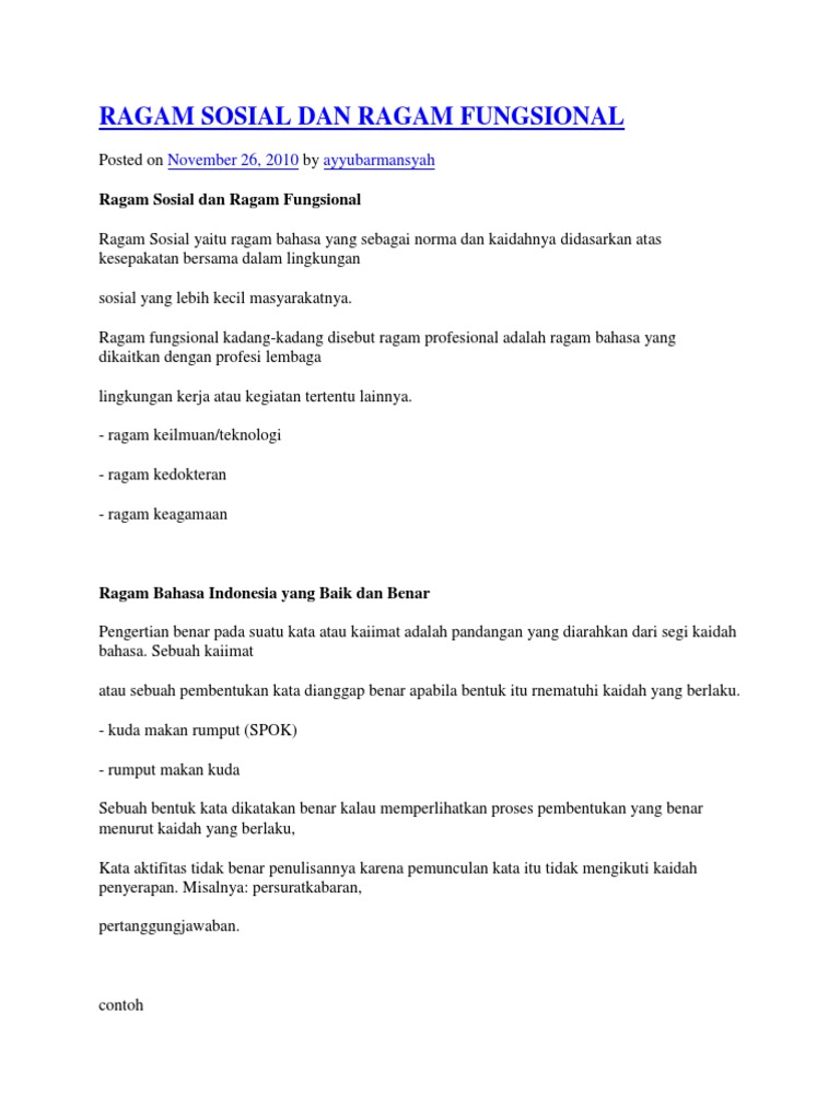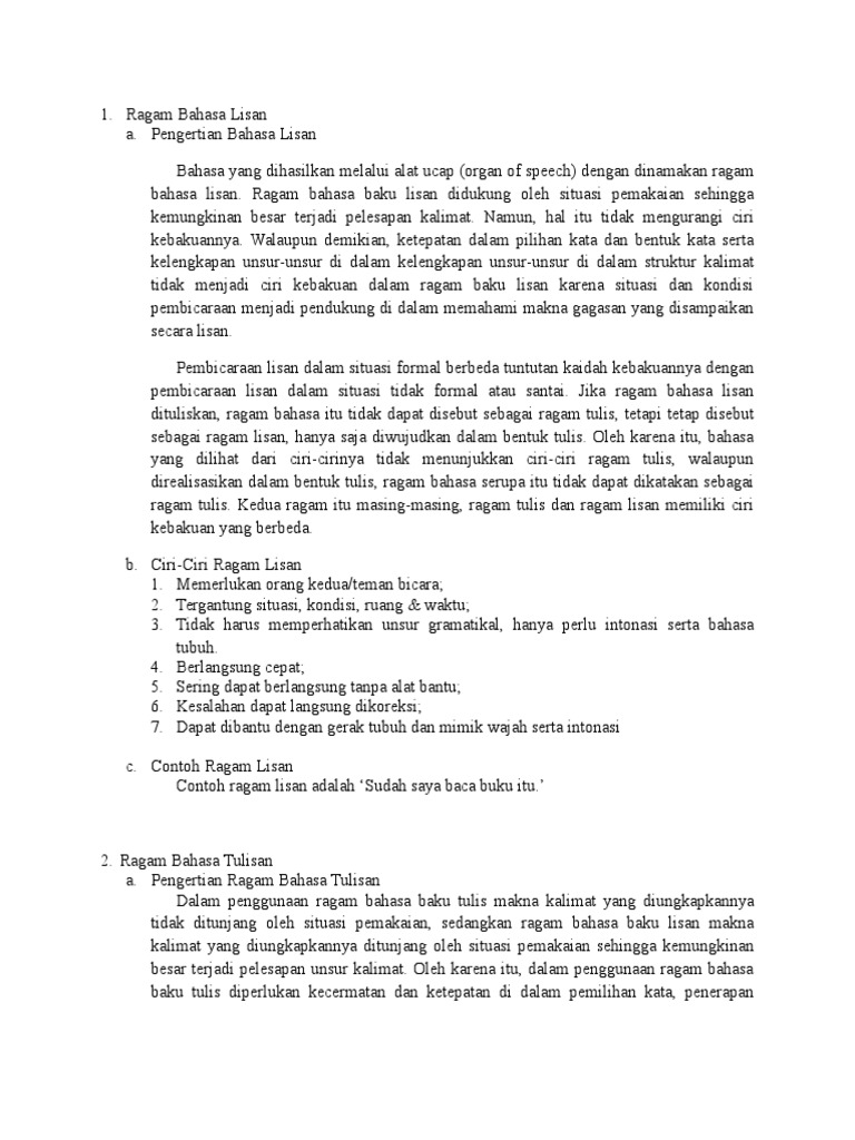Ragam bahasa terbagi dua jenis yaitu bahasa lisan dan bahasa baku tulis. Contoh ragam bahasa lisan antara lain ceramah pidato sambutan berbincang bincang dan lain sebagainya. Mereka tinggal di menteng. A tata bahasa bentuk kata tata bahasa struktur kalimat kosa kata ragam bahasa lisan. Enggak sengaja ardi nginjak pecahan gelashingga kakinya luka. Nia sedang baca surat kabar.