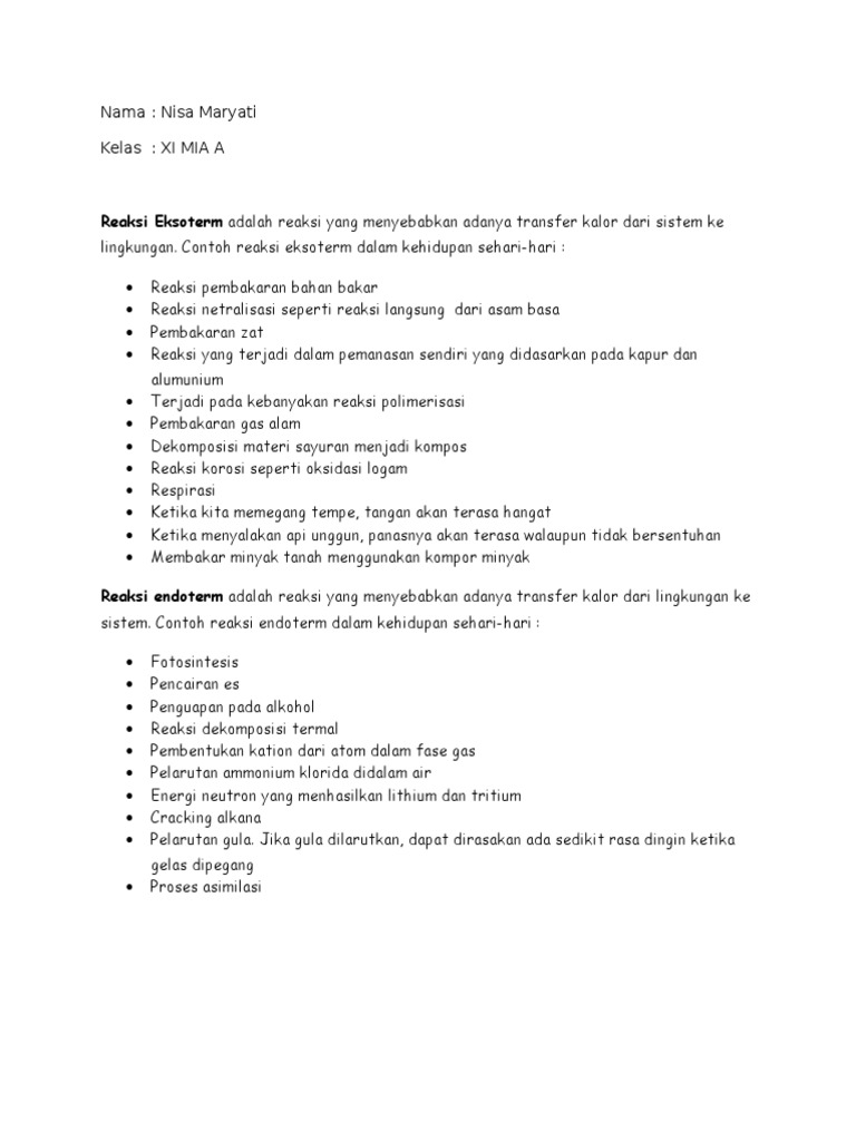 Contoh reaksi eksoterm dalam kehidupan sehari hari. Berikut adalah 10 contoh reaksi kimia dalam kehidupan sehari hari. Keberadaan reaksi kesetimbangan ini bahkan menjaga hidup kita seperti beberapa contoh berikut ini. Berikut contoh reaksi eksoterm di kehidupan sehari hari. Contoh reaksi eksoterm dan endotermreaksi eksoterm merupakan reaksi yang melepaskan kalor dari sistem ke lingkungan sementara itu reaksi endoterm merupakan reaksi yang menyerap kalor dari lingkungan ke sistem. Mencampurkan air dengan kristal garam. Tubuh kita hidup dan tumbuh berkat reaksi kimia.
