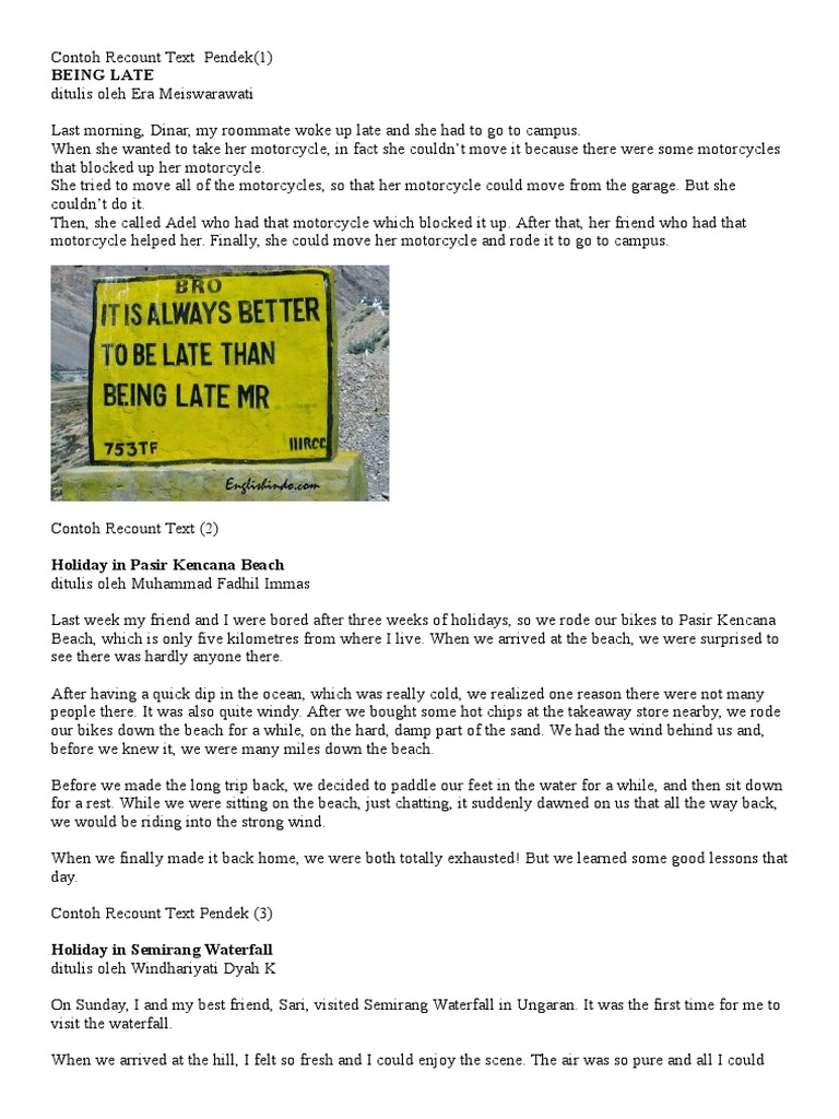 Contoh recount text merupakan salah satu jenis materi dalam bahasa inggris yang biasanya menceritakan tentang makalah pengalaman pengalaman kegiatan dimasa lampau dengan maksud ingin menghibur si pembaca. Contoh recount text singkat tentang liburan keluarga recount text adalah sebuah te ks yang menceritakan sebuah cerita aksi maupun aktifitas yang terjadi di waktu lampau. My awful holiday at home. Sebelum kita melihat contoh recount text berikut alangkah baiknya kita mengingat kembali what is recount text apakah teks recount itu. 25 contoh recount text pendek singkat dalam bahasa inggris dan artinya biasanya sebagai latihan tugas di awal semester tahun ajaran baru para guru bahasa inggris akan memberi kita tugas untuk membuat contoh recount text yang pendek teks recount sederhana atau mungkin juga text recount pendek dan sederhana tentang liburan atau tentang pengalaman selama liburan. 1 7 contoh recount text tentang pengalaman pribadi liburan dan artinya full materi dan generic structure untuk melengkapi bahasan kita tentang recount text full materi dan generic structure kali ini saya akan sajikan beberapa kumpulan contoh recount text terbaru dan original khusus buat sobat pecinta bahasa inggris dimanapun beradacontoh text recount di bawah terdiri dari beberapa.