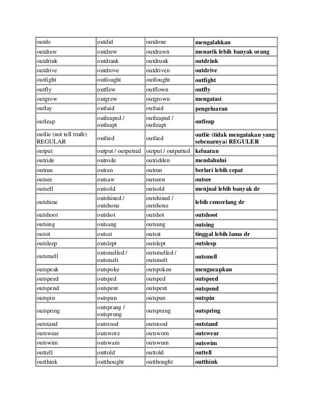 Regular dan irregular verb adalah pembagian kata kerja berdasarkan perubahan waktu atau cara penulisannya. Daftar irregular verb ini berisi 470 kata kerja tidak teraturan yang digunakan dalam bahasa inggris baik yang kuno sampai yang moderen. Kosakata bahasa inggris list regular verb 1 2 3 irregular verb atau kata kerja tak beraturan seperti contohnya dalam bentuk verb 2 bahasa inggris dan penelasannya. Simak penjelasan dibawah ini guys. Kami akan membahas mulai dari daftar contoh kalimat dan artinya dari a sampai z. Irregular verb sebelumnya kita telah menuliskan tentang kosakata kata kerja dan juga daftar regular verb yang biasa digunakan dalam kehidupan sehari hari.