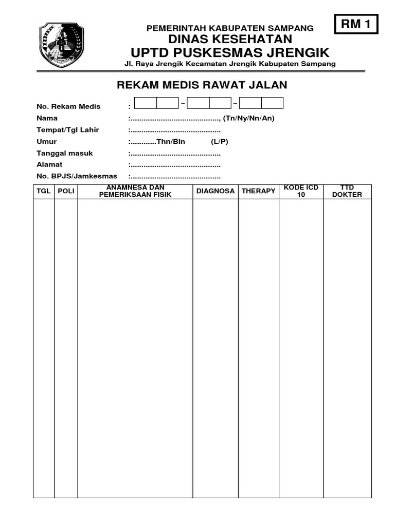 Contoh rekam medis puskesmas. Rekam medis di sarana pelayanan kesehatan primer puskesmas rekam medis di puskesmas merupakan salah satu sumber data penting yang nantinya akan diolah menjadi informasi. Rekam medis adalah berkas yang berisikan catatan dan dokumen tentang identitas pasien pemeriksaan pengobatan tindakan dan pelayanan lain kepada pasien pada sarana pelayanan kesehatan permenkes 749a tahun 1989 sehingga menghasilkan informasi yang lengkap dan akurat untuk menunjang peningkatan. Rekam medis untuk pasien rawat jalan termasuk pasien gawat darurat. 269menkesperiii2008 tentang rekam medis pada pasal 9. Simak penjelasan terlengkapnnya di bawah ini. Kasus polisi 6 datang sendiri.