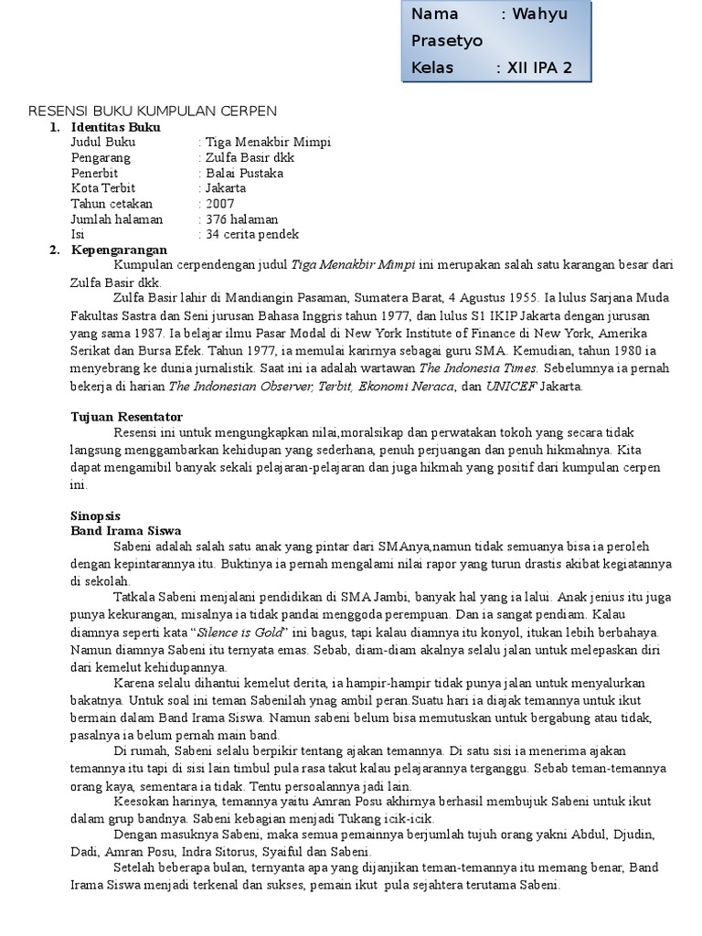 Definisi resensi dan contoh resensi cerpen pada kali ini kami akan menjelaskan mengenai resensi. 2 cara membuat resensi. Contoh resensi buku cerpen beserta cerpennya contoh resensi buku cerpen. Demikianlah contoh cerpen beserta sinopsisnya dalam bahasa indonesia. Dibawah ini merupakan contoh resensi cerpen sebagai bahan tambahan pengetahuan kita tentang resensi cerpen itu sendiri. Terlepas dari perdebatan bahwa karya sastra adalah imajinasi pengarang yang pasti bagi pengarang atau setidaknya bagi saya untuk melahirkan karya sastra membutuhkan inspirasi.