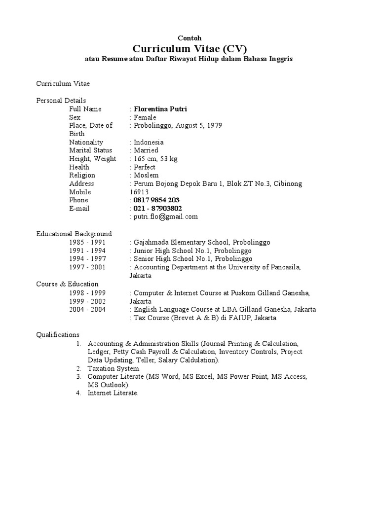 Contoh riwayat hidup dalam bahasa inggris. Saat kita ingin melamar kerja kita perlu membuat daftar riwayat hidup atau curriculum vitae. Cv atau nama lainnya daftar riwayat hidup dalam bahasa inggris kadang sangat dibutuhkan walaupun bekerja di perusahaan instansi dalam negeri. Resume atau daftar riwayat hidup dalam bahasa inggris kadang juga diperlukan meskipun bekerja di perusahaan instansi dalam negeri. Contoh daftar riwayat hidup bahasa inggris. Tips membuat cv daftar riwayat hidup. Daftar riwayat hidup dalam bahasa inggris biasanya digunakan untuk pelamar yang akan melamar pada perusahaan asing.