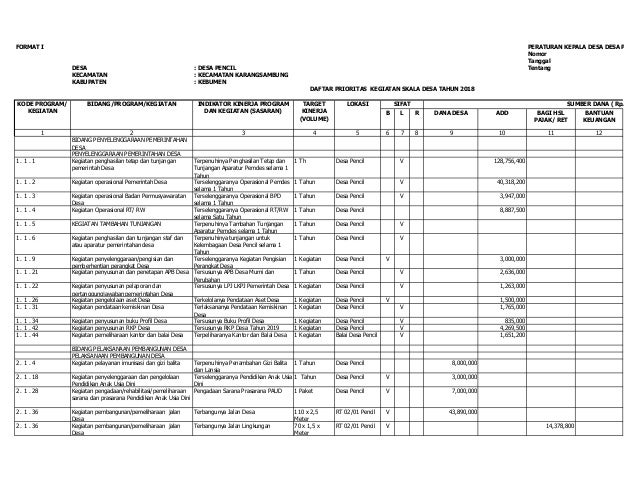Rpkdes atau rencana kerja pemerintah desa merupakan dokumen perencanaan yang memuat pokok pokok kebijakan pembangunan di desa dan mengarahkan pencapain tujuan visi dan misi desa. Apbdes 2019 contoh format lengkap saat ini mungkin kita tengah sibuk sibuknya mengurus melaksanakan dan merampungkan kegiatan kegiatan di desa untuk tahun 2018. Oleh karena itu setiap desa diwajibkan menyusun rkpdesa untuk setiap rencana kerja pemerintah desa tahun berikutnya. Menyelesaikan rkp desa lebih cepat dan setidaknya tepat waktu merupakan hal baik yang dapat anda kerjakan. Karena saat ini kita sudah berada di penghujung tahun 2018 dan tiba waktunya untuk merencanakan kegiatan dan merencanakan anggaran kegiatan untuk tahun selanjutnya tahun anggaran 2019. Rancangan rkp desa menjadi lampiran rancangan perdes rkp desa yang dibahasdisepakati antara kepala desa dan bpd untuk ditetapkan menjadi peraturan desa tentang rkp desa.