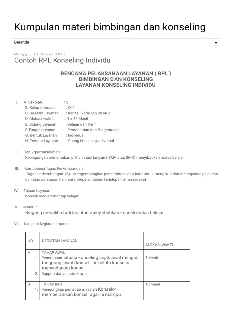 Dari hasil wawancara antara konselor dengan konseli maka rencana layanan yang akan konselor berikan untuk membantu konseli mengentaskan permasalahan yang dialaminya adalah dengan layanan konseling individual. Tumbuh kembang remaja bidang bimbingan. Download file format docx microsoft word ini mudah mudahan bisa bermanfaat dan menjawab pencarian anda tentang rpl bk karir rpl bk smp kurikulum 2013 rpl bk bimbingan kelompok rpl bk smp kurikulum 13 rpl bk sma rpl bk smp rpl bk smp kelas 7 rpl bk smp kelas 8 rpl bk smp kelas 9 rpl bk. Contoh rpl konseling individu 0953 unknown rencana pelaksanaan layanan rpl bimbingan dan konseling. Academiaedu is a platform for academics to share research papers. Agar mampu mengaktualisasikan potensi dirinya dalam rangka mencapai perkembangan secara optimal.