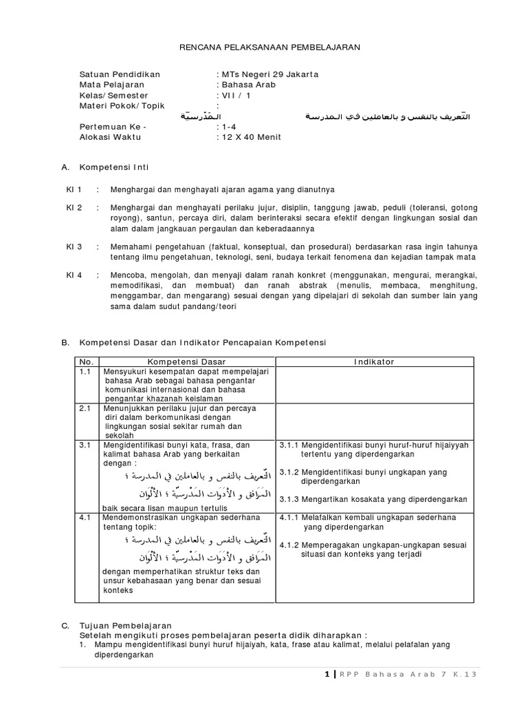 Rpp ini digunakan pada penelitian tindakan kelas ptk pada siklus pertama. Ixi materi pokok. Bahasa arab pertemuan ke. Rpp bahasa arab kelas 123456 mi kurikulum 2013 semester 1 dan 2 dalam postingan kali ini saya akan bagikan salah satu perangkat pembelajaran untuk guru madrasah ibtidaiyah mi khususnya mata pelajaran bahasa arab. 1 4 kelassemester. Rencana pelaksanaan pembelajaran rpp nama sekolah.