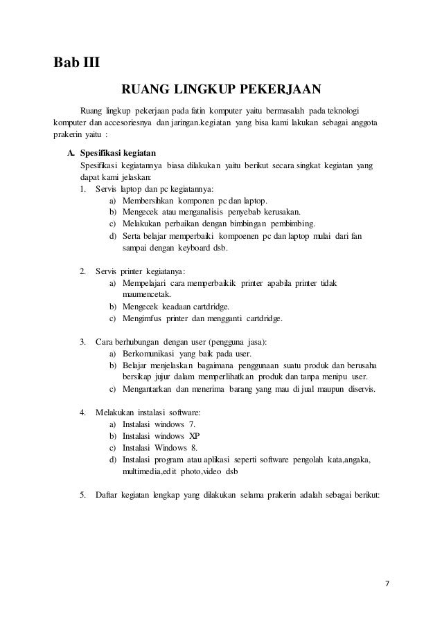 Contoh ruang lingkup laporan pkl. Contoh laporan untuk kamu yang masih yang masih bingung dalam membuat laporan pkl atau prkerin silahkan simak artikel berikut ini karena dalam artikel ini akan dibahas tuntas mengenai pedoman membuat laporan pkl contoh laporan pklprakerin yang baik dan benar. Laporan mempunyai peranan yang penting pada suatu organisasi karena dalam suatu. Ruang lingkup menurut guy 2002410 ruang lingkup audit internal meliputi pemeriksaan dan evaluasi yang memadai serta efektifitas sistem pengendalian internal organisasi dan kualitas kinerja dalam melaksanakan tanggungjawab yang dibebankan.