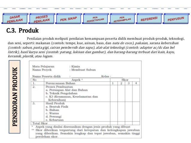 Pertama kita harus membuat perencanaan penilaian baik itu instrumen penilaian indikator penilaian rubrik penilaian kriteria penilaian sampai pada cara pengolahan penilaian. Jadi untuk penilaian produk sendiri dapat dilakukan penilaian mulai dari tahap persiapan tahap pembuatan atau proses dan tahap akhir pembuatan produk seperti pada contoh di atas. Penilaian di kelas bertujuan untuk mengumpulkan informasi tentang ketercapaian kurikulum yang menjadi target pembelajaran. Penilaian produk umumnya dilakukan terhadap pencapaian kompetensi belajar siswa dalam menghasilkan produk produk belajar yang berkualitas seperti membuat kumpulan puisi membuat naskah drama membuat artikel ilmiah untuk media massa membuat karya tulis ilmiah membuat produk karya seni menyusun dokumen kebijakan publik dan sebagainya. Instrumen di atas sudah dicantumkan langsung dengan rubrik dan pedoman penskorannya. Penilaian kinerja merupakan bentuk penilaian yang menuntut peserta didik mempraktikkan dan mengaplikasikan pengetahuan yang sudah dipelajari ke dalam berbagai macam konteks sesuai dengan kriteria yang diinginkan.