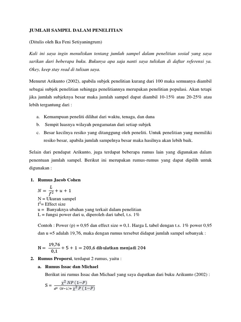 Teknik pengambilan sampel tujuan dari pengambilan sampel dalam suatu penelitian yaitu untuk menghemat biaya tenaga dan juga waktu. Ukuran sampel berdasarkan proporsi tabel isaac dan michael tabel penentuan jumlah sampel dari isaac dan michael memberikan kemudahan penentuan jumlah sampel berdasarkan tingkat kesalahan 1 5 dan 10. Seorang produsen akan melakukan sebuah penelitian terhadapat karyawannya yang berjumlah 1000 orang dan taraf signifikansinya 005 pada suatu perusahaan. Apabila subyek populasi tidak homogen maka kesimpulannya tidak boleh diberlakukan bagi populasi. Menurut arikunto 2006133 kita boleh mengadakan penelitian sampel bila subyek didalam populasi benar benar homogen. Seolah olah kita bisa langsung tetapkan bahwa sampel minimal yang diambil dari rumus ini dapat digunakan bahwa hasil penelitian nantinya mempunyai tingkat kesalahan sesuai dengan rumus ini.