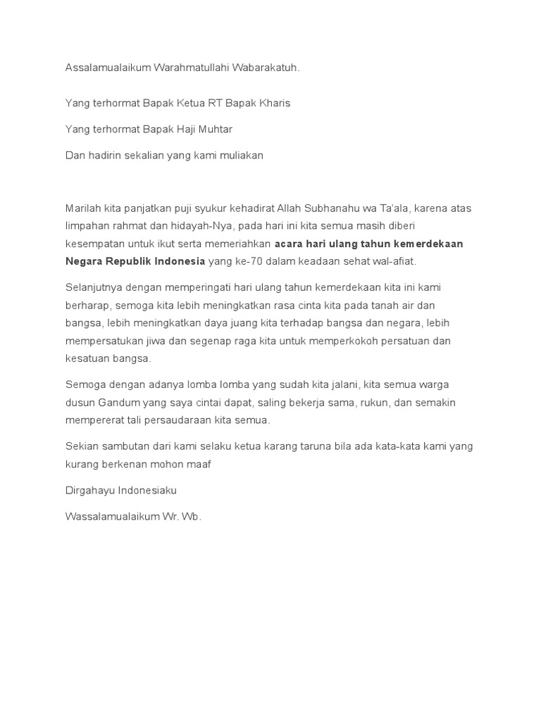 Kelengkapan panitia 17 agustus akan sangat berguna dalam kelangsungan kegiatan menyambut hut ri 74. Untuk lebih jelasnya dibawah ini kami akan memberikan contoh kata sambutan ketua rt di acara 17 agustus. Pidato sambutan ketua panitia pelaksana peringatan hut republik indonesia 17 agustus kali ini admin postingkan contoh pidato sambutan ketua panitia atau ketua pelaksana kegiatan hut ri silahkan simak di bawah ini. Kata sambutan ketua rt 01106 untuk acara 17 agustus 2015 201900 berita terkini sambutan assalamualaikum wr wb bapakibu serta seluruh warga rt 011 rw 06 mekarjaya kota depok yang saya hormati. Salam sejahtera untuk kita semua. Yang terhormat ibu ketua rt 30 kampung terban.