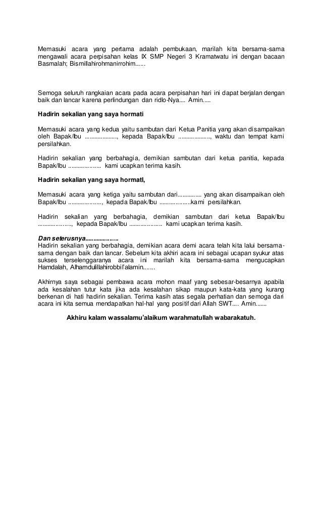 Contoh sambutan perpisahan sekolah. Sambutan perpisahan apapun bentuk perpisahannya baik itu perpisahan kelassekolah pegawai yang telah mutasi atau pensiun maupun perpisahan lainnya pada intinya memiliki muatan dasar yang sama. Pidato perpisahan adalah ungkapan pikiran dalam bentuk kata kata yang tersusun menjadi kalimat untuk ditujukan kepada khalayak ramai. Pidato perpisahan dalam contoh kali ini terdiri dari teksnaskah pidato yang berisi kata kata perpisahan sekolah sd smp sma atau kelas 6 9 12 dan perpisahan dalam acara wisuda sarjana. Pidato perpisahan sekolah sekolahpidato perpisahan sekolah adalah kata sambutan yang berisikan tentang ucapan perpisahan yang disampaikan oleh siswa alumni kepada gurunya. Contoh pidato perpisahan sekolah oleh siswa. Pada umumnya pidato perpisahan sekolah selalu berisikan.