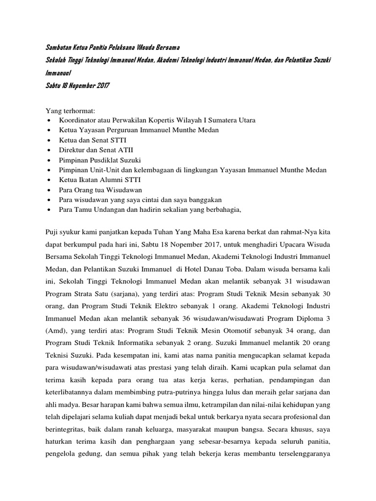 Pidato untuk acara wisuda salah satu kegiatan yang paling membahagiakan bagi seorang mahasiswa ketika sedang mengenyam bangku kuliah adalah dapat selesai tepat waktu dan lebih istimewa lagi jika menjadi seorang wisudawan terbaik. Kata sambutan adalah suatu kalimat atau kata kata yang.