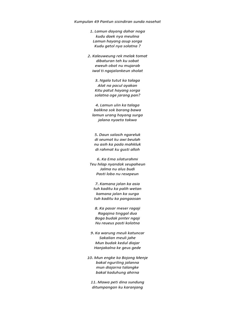 Download kumpulan contoh sisindiran pantun bahasa sunda cerpen atau carpon bahasa sunda lengkap dan kumpulan dongeng bahasa sunda beserta cerita rakyat basa sundasisindiran adalah sebuah pantun bahasa sunda yang isinya saling menyindir tapi guyonanjadi sisindiran itu biasanya dilakukan oleh dua orang atau lebihjadi pantun nya saring berbalassehingga sisindiran ini lebih menarik dari. Sisindiran adalah sebuah karya sastra yang dimuat dalam bahasa sunda dalam sisindiran sendiri terbagi menjadi beberapa bagian diantaranya ada yang memberikan nasihat dan ada juga yang hanya sekedar pribahasa.