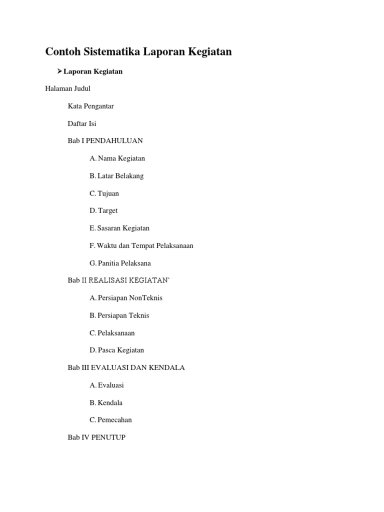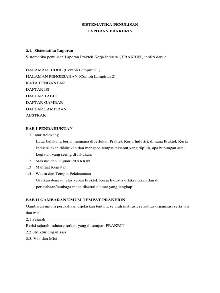 Contoh sistematika penulisan laporan. Dalam penulisan laporan praktek kerja lapangan pkl atau ptakerin harus memenuhi ketentuan yang dibakukan. Guna memahami lebih jelas laporan skripsi ini dilakukan dengan cara mengelompokkan materi menjadi beberapa sub bab dengan sistematika penulisan sebagai berikut. Dibawah ini dicantumkan sistematika penulisan laporan praktek kerja lapangan pkl prakerin yaitu. Cepat atau lambat kamu pasti akan diberikan tugas untuk membuat sebuah makalahtentu saja hal ini perlu memperhatikan beberapa aspek sehingga makalah yang kamu buat terkesan tidak asal asalan dan mendapatkan nilai yang baik oleh pengoreksi. Sistematika laporan penelitian bagian awal hal hal yang termasuk bagian awal adalah. Contoh skripsi dan sistematika penulisan skripsi ini hanyalah salah satu rujukan pendukung.