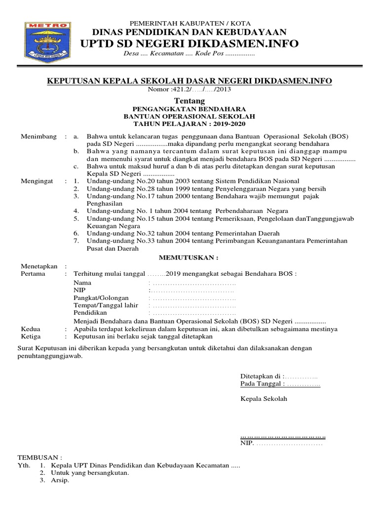 Bahwa saat ini sudah diatur juga dalam juknis bos untuk honor seorang bendahara bos yang jumlahnya sekitar rp250000 ini merupakan honorarium untuk bendahara bos di daerah kami. Contoh sk tata usaha sekolah dasar.
